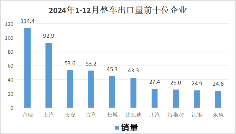 农业机械:农用动力机械、耕零件械、植保机械、做物收成机械、播种和施肥机械、农田排灌机械、农业东西、饲料加工设备、畜牧业机械等?。 2024年,整车出口前十企业中,从增速上来看,比亚迪出口43。3万辆,同比增加71。8%;长安出口53。6万辆,同比增加49。6%;江淮出口24。9万辆,同比增加46。7%。 2024年我国汽车产销总量持续16年稳居全球第一。汽车产销别离完成3128。2万辆和3143。6万辆,同比别离增加3。7%和4。5%。