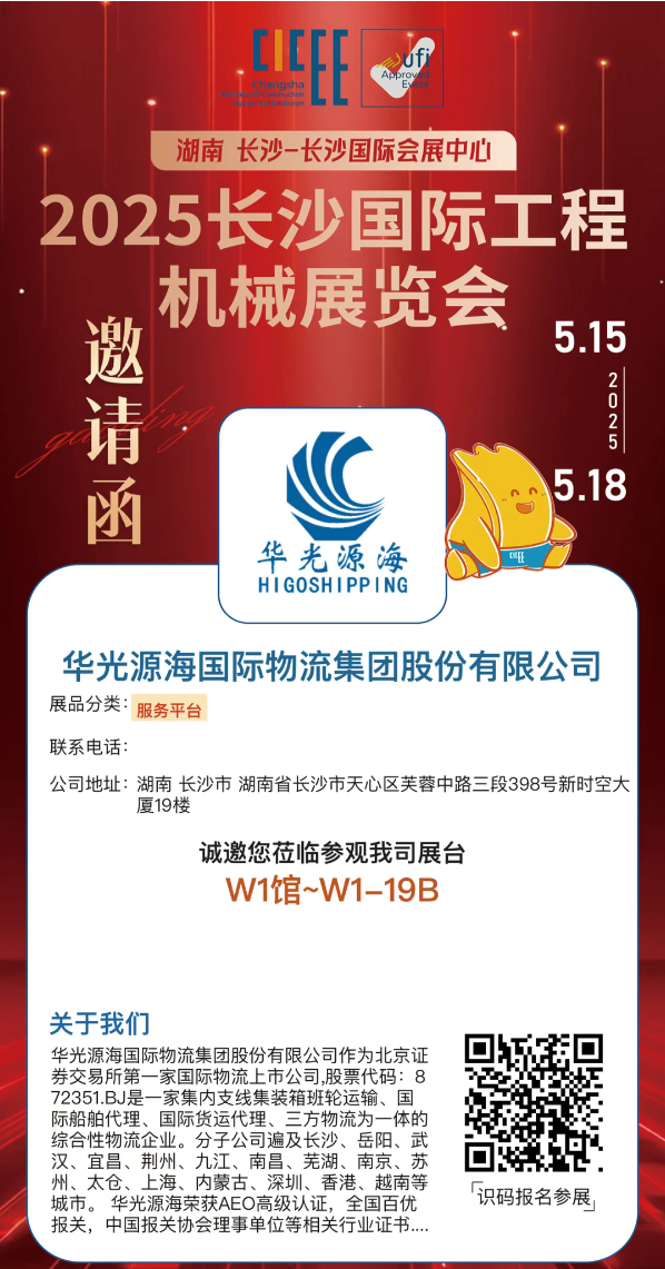 华光源海做为证券买卖所第一家国际物流上市公司,专注于国际物风行业近二十年,供给包罗海运整箱、品海运、杂项物品、船埠办事、报关报检、项目物流、海铁联运、空运出口等一坐式办事 。我们诚挚邀请您莅临华光源海展位【W1-19B】,我们等候取更多有识之士成立合做关系,配合摸索物风行业的立异之。同时,我们也将分享华光源海对将来物流市场趋向的洞察取瞻望,取您一同物风行业的兴旺成长。 由中国机械工业结合会、中国工程机械学会等结合从办的2025长沙国际工程机械博览会将于05月15日-05月18日正在长沙国际会展核心隆沉揭幕。智能化、绿色化为从题,聚焦新一代工程机械、应急配备、矿山配备、农业机械及相关零部件,,诚邀人士莅临参不雅交换,等候取您一同这场工程机械行业的嘉会,共探行业新趋向,共寻合做新契机。 做为全球三大工程机械财产集聚地之一,2025CICEE将汇聚35家全球工程机械制制商50强企业,展区划分为工程机械、应急配备、矿山配备、农业机械四大从题板块,2万余台(套)展品。此中,75%的沉型机械实现绿色化升级,1500项全球首发手艺及产物将集中表态,涵盖氢能动力农、AI无人矿山配备、5G智能应急系统等前沿范畴。展会更特设“世界初创+世界首台/套”新产新手艺专区,以硬核科技注释“高端化、智能化、绿色化”转型标杆。
